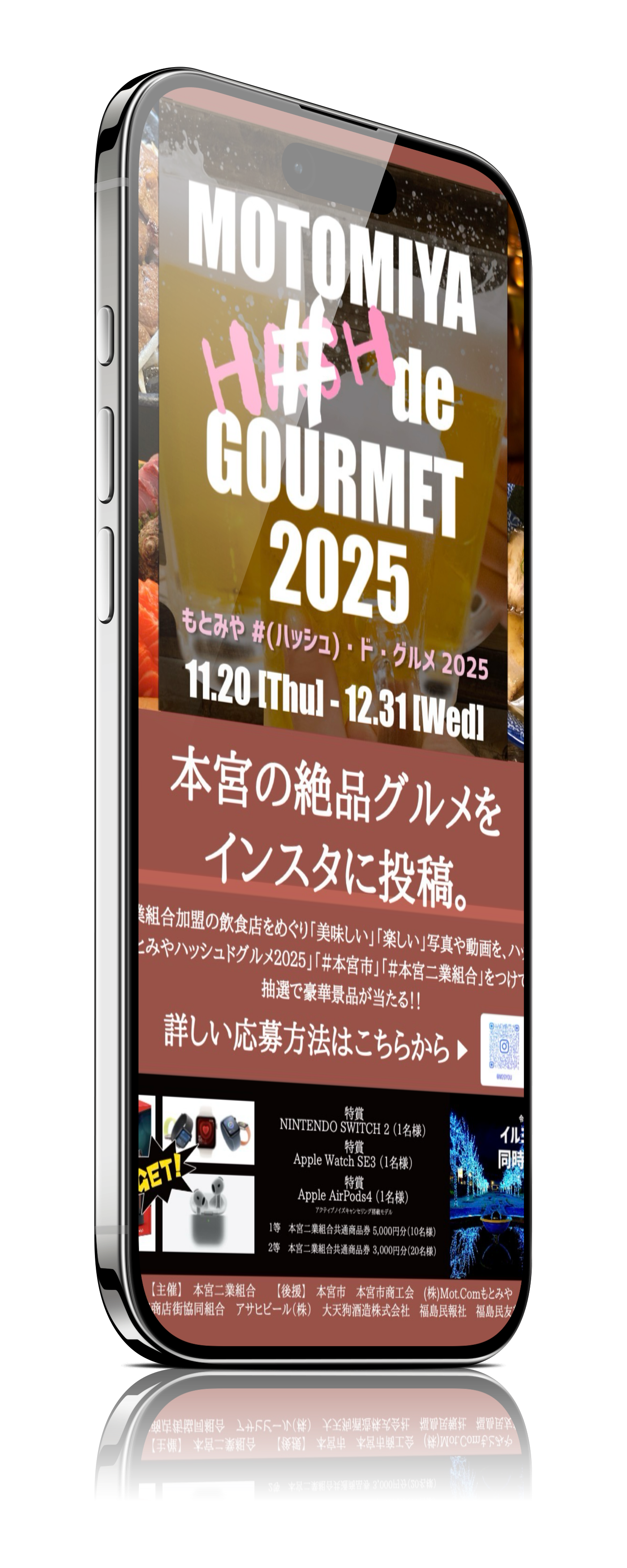 本宮二業組合加盟の飲食店をめぐり「美味しい」「楽しい」写真や動画を、ハッシュタグ「#もとみやハッシュドグルメ2025」「本宮市」「本宮二業組合」をつけてInstagramに投稿!抽選で豪華景品が当たる!!