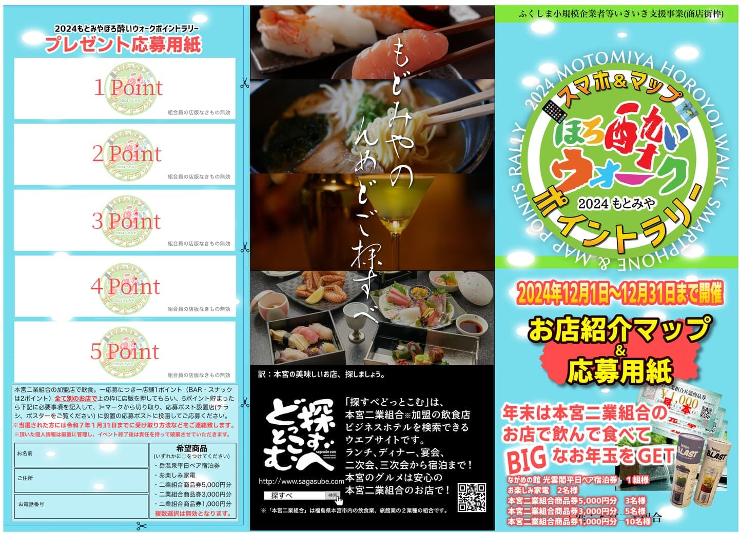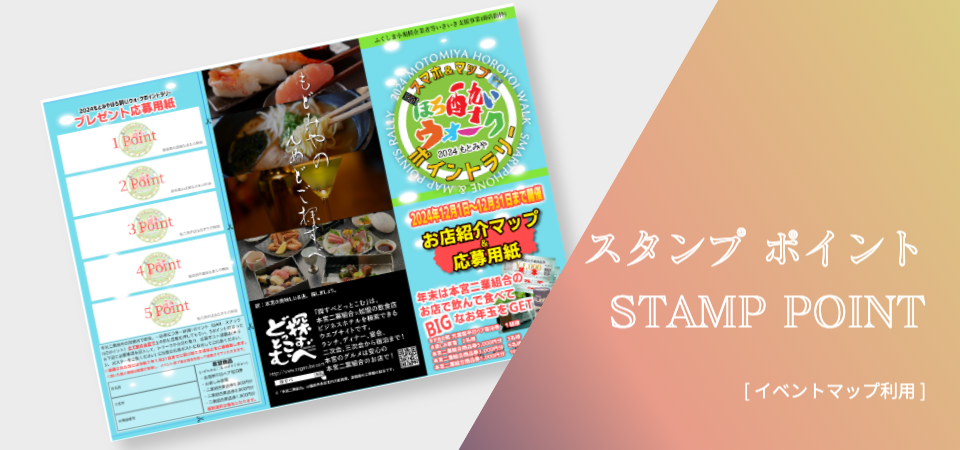 2024もとみやほろ酔いウォークポイントラリーは、期間中に本宮二業組合加盟店(42店舗)をご利用していただき、5ポイントを一口として豪華プレゼントに応募できるイベントです。ポイントはお店の業種により異なり、1,500円のご飲食で「バー」「スナック」は【2ポイント】。その他の店舗は1ポイント付与となります。